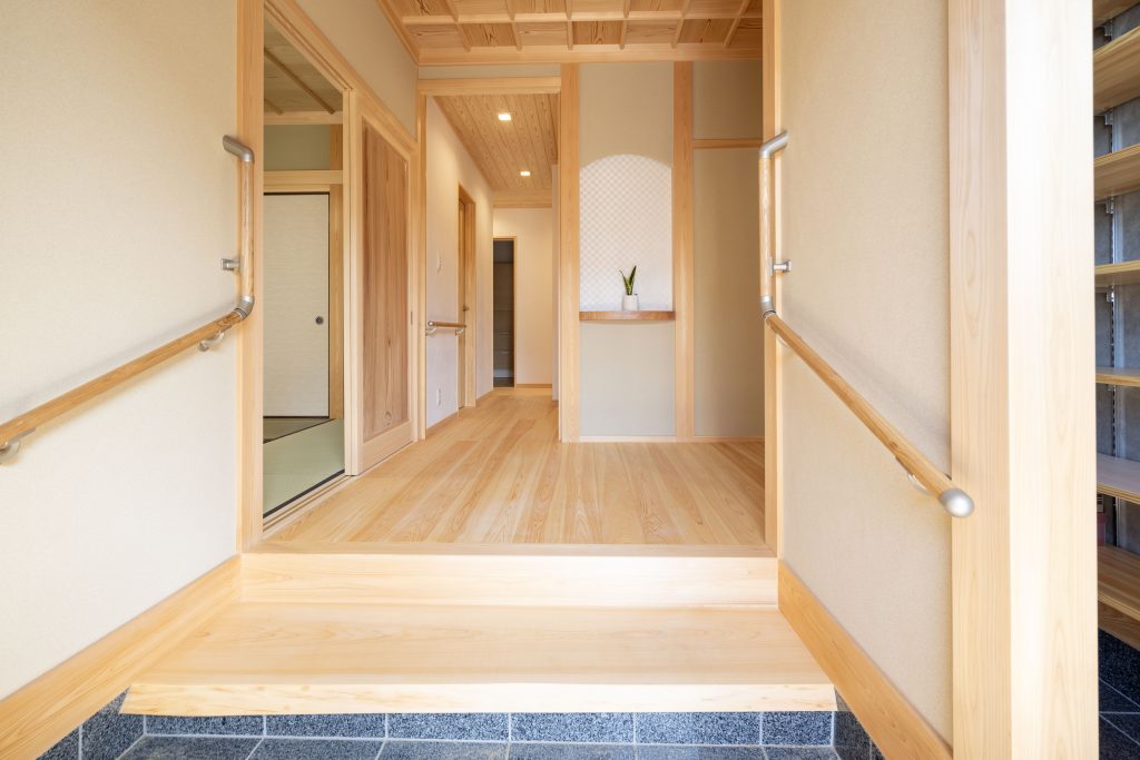 玄関には段差に優しい手すりを設置。将来を見据えた“やさしい配慮”が、さりげなく溶け込んでいます。