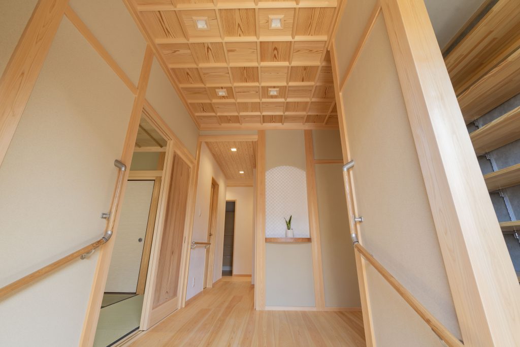 格子天井の繊細な意匠が空間に格を与え、杉や桧がふんだんに使われた無垢の床材が足元からやさしく迎えてくれます。
